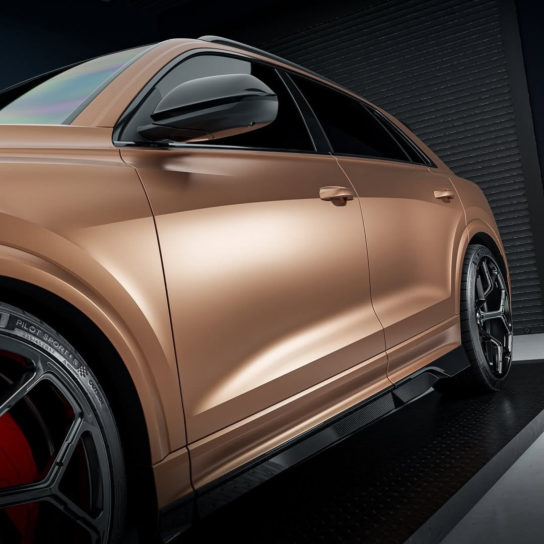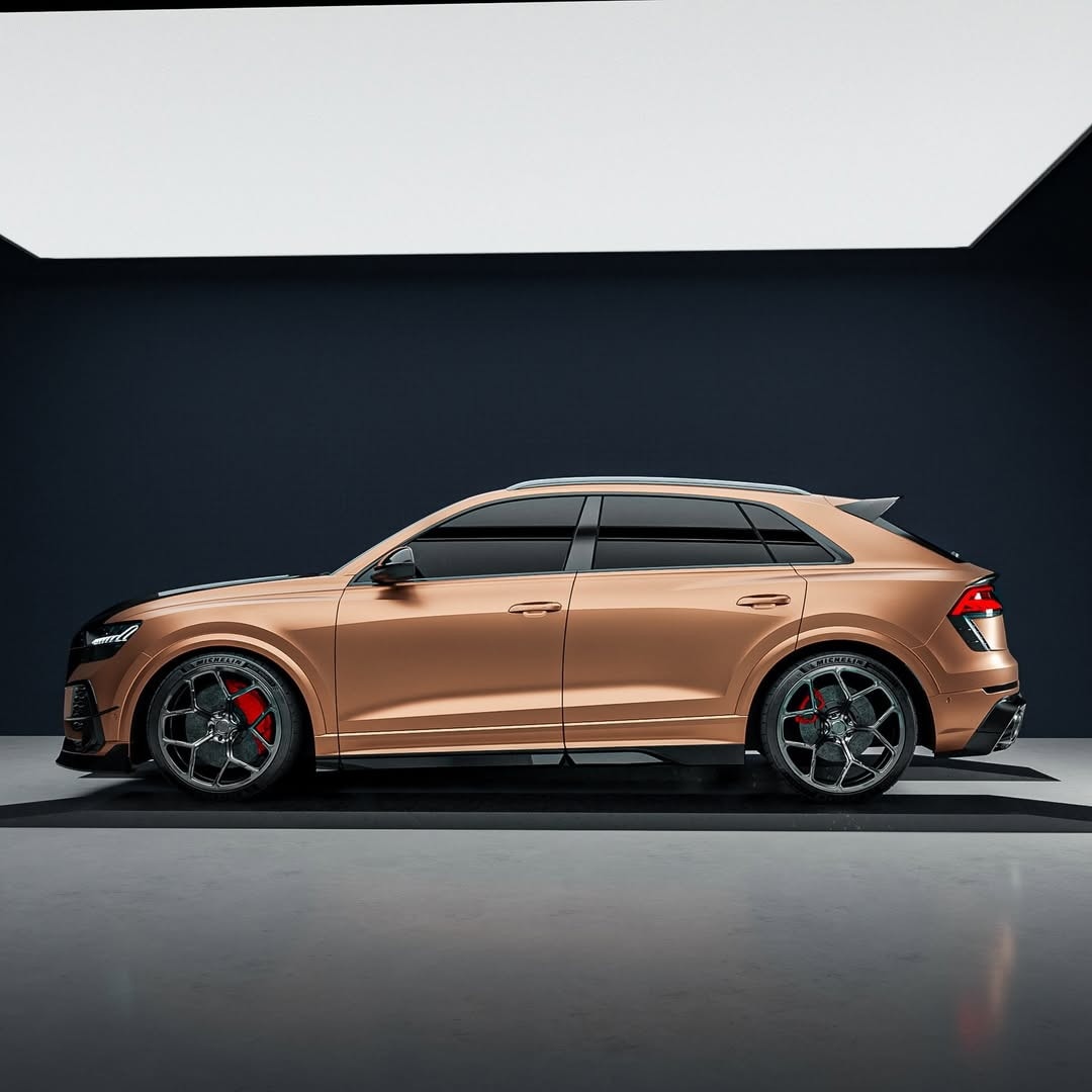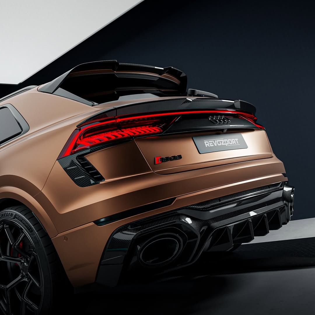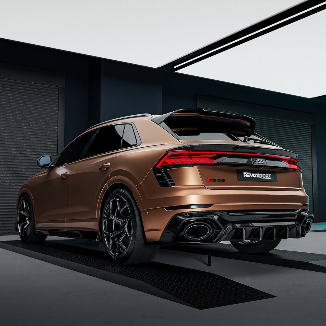 RevoZport returns with another visual package, this time built around the Audi RS Q8. The Hong Kong tuner names the conversion Street Body Kit and applies a full set of carbon-fiber exterior parts to Audi’s high-output sport utility vehicle. The project appears in a copper-brown finish with black contrast surfaces, exposed composite trim, and red brake calipers behind aftermarket wheels.