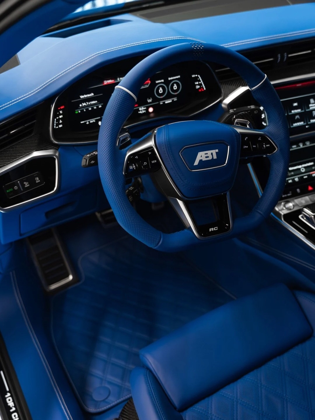 Inside, the tone changes but stays linked to the body color. Blue leather wraps the seats first, then spreads across the steering wheel, dashboard panel, center console, and door cards. White stitching breaks the surfaces. Carbon fiber trim enters several areas. Door sills carry ABT logos, and more branding appears elsewhere in the cabin.